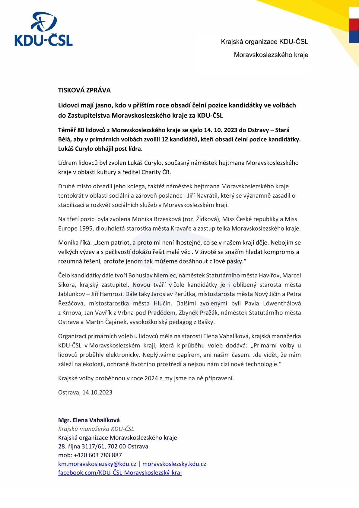 Lídrem lidovců byl zvolen Lukáš Curylo, současný náměstek hejtmana Moravskoslezského kraje v oblasti kultury a ředitel Charity ČR.