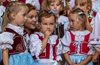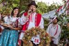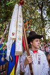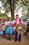 Zde pak proběhlo slavnostní předání dožínkového věnce a koláče panu starostovi a jeho ženě.